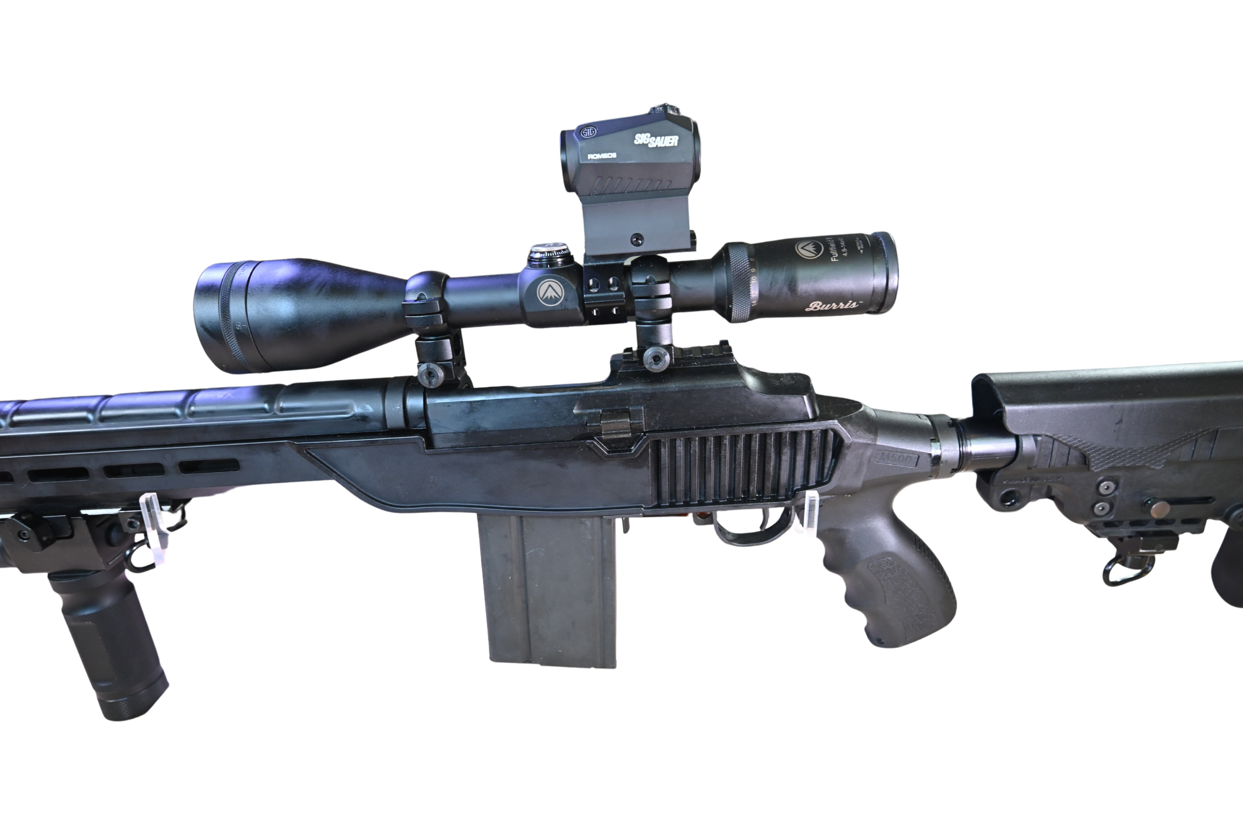 The combination of magnified optic and red dot provides versatility for both precision shooting and faster engagement scenarios.