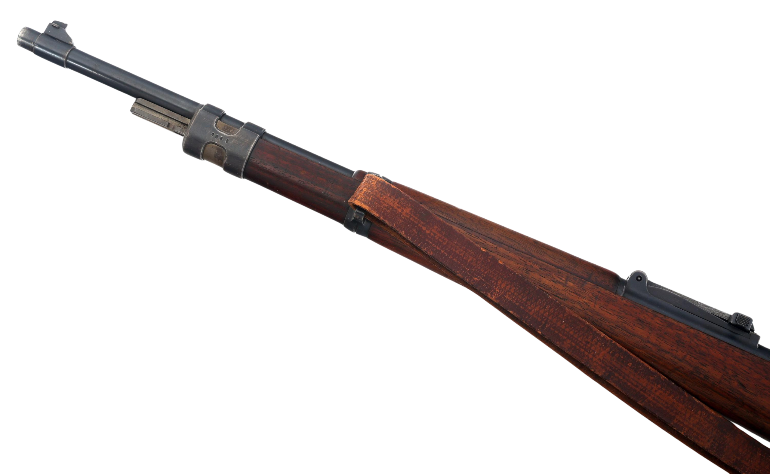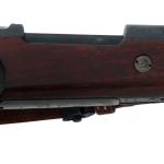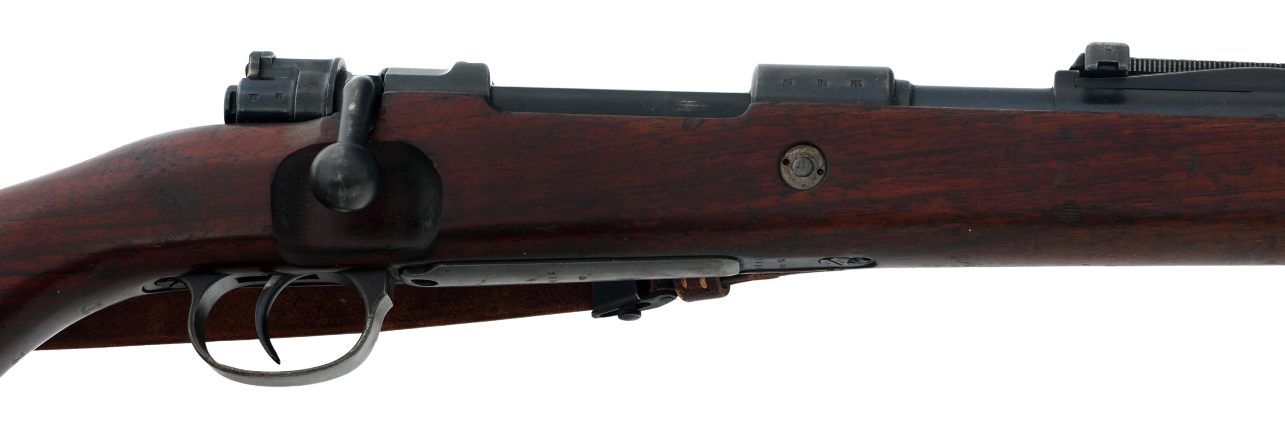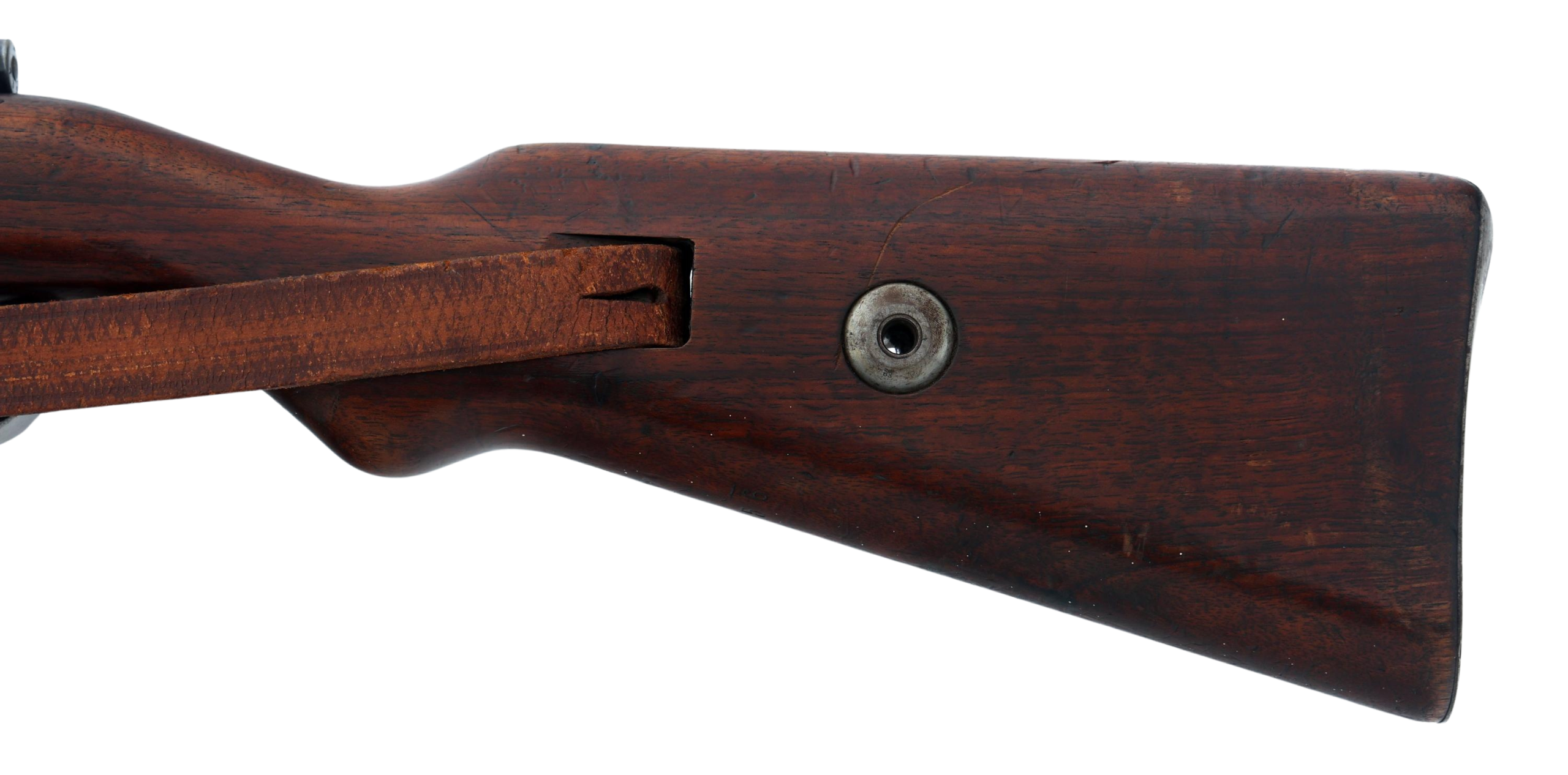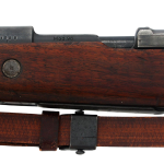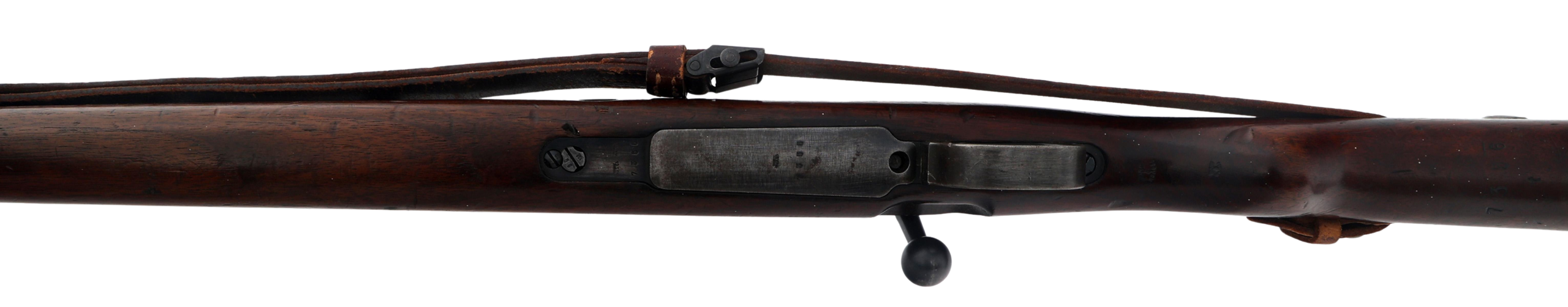 This rifle retains its original wood stock, steel buttplate, bayonet lug, and period leather sling. The metal finish shows honest service wear consistent with age, while the stock displays expected handling marks with no evidence of sanding or refinishing. No import marks are present, a major factor in collector value and originality.