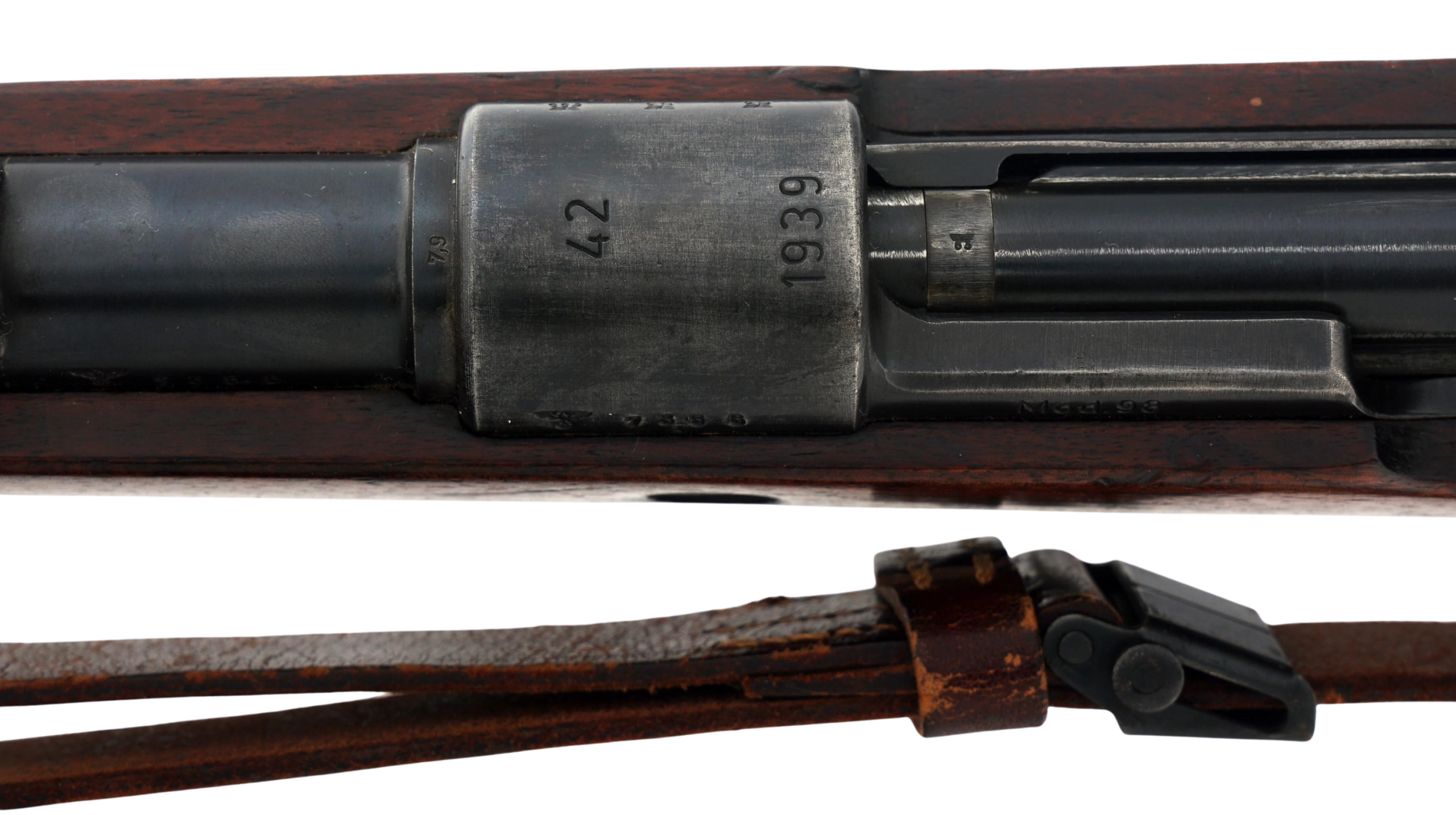 The receiver is clearly stamped “42 / 1939”, with correct Waffenamt WaA63 inspection marks and German military acceptance proofs. The right side of the buttstock bears correct Heer acceptance stamps, including E/H and WaA655, consistent with period-correct military issue.