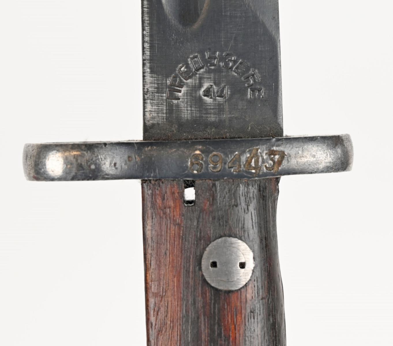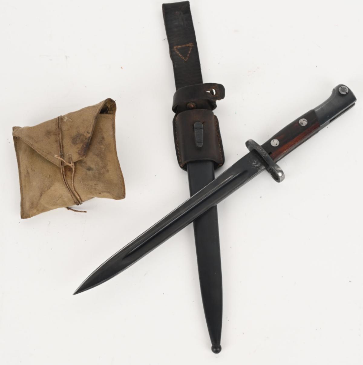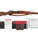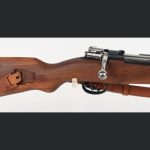 Produced in Yugoslavia as the country’s domestic replacement for the German K98 and built on the large-ring Mauser 98 action with a 5-round internal magazine. The rifle features a full-length wood stock with handguard, hooded front sight, RPK-style rear sight, and is marked with the Yugoslav crest and “M48” on the receiver, and it includes a leather sling. This example is exceptionally complete, coming with an M48 bayonet marked “Factory 44” in Serbian writing with sheath and frog, a leather ammunition belt storage pouch, a cleaning kit with canvas pouch, bore brush, oiler, and pull-through rope, as well as the factory certificate of authenticity and manuals. Condition is listed as excellent at approximately 98% with normal mechanical operation, while the bayonet is in very good condition and the cleaning kit remains serviceable.